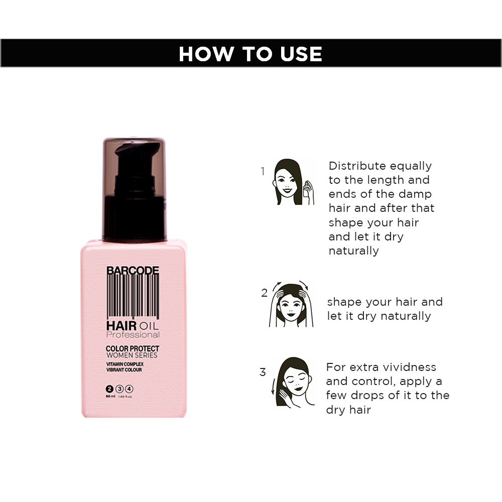 Distribute equally to the length and ends of the damp hair and after that shape your hair and let it dry naturally.For extra vividness and control, apply a few drops of it to the dry hair. Do not rinse.